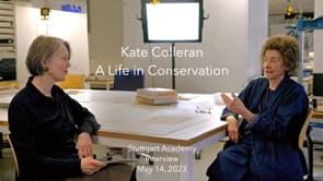 Interview mit der Papierrestauratorin und Lehrenden Kate Colleran, am 14. Mai 2023. Kate Colleran spricht über ihre eigene Ausbildung, über ihre Lehrtätigkeit am Stuttgarter Studiengang für Papierrestaurierung und über ihre Arbeit als niedergelassene Restauratorin in London und Betreuerin von Sommerpraktika in den Worcester College Special Collections an der Universität Oxford (UK), wo sie viele Studenten aus verschiedenen Studiengängen, darunter auch aus Stuttgart, betreute. Sie spricht auch über die Lehrsammlung von Papierobjekten, die sie dem Stuttgarter Programm als Schenkung überlassen hat. Einige dieser Objekte werden während des Interviews gezeigt (Sprache: Englisch).