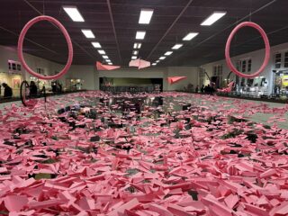 Eine interaktive Rauminstallation. Ein Papierflugzeug ist ein Flugzeug aus Papier, das hauptsächlich durch Falten entsteht. Wir wissen, wie man einen bastelt. Aber warum? Während des „Dilly Dally Design Markets“ in Regensburg liegen rosa Papierbögen aus. Aus in der Landwirtschaft genutzten Schutznetzen (32 m x 15 m), Fahrradreifen und überdimensionalen rosa Kartonpapierfliegern habe ich ein Fluggelände erstellt. Ohne schriftliche Erläuterungen oder eine genaue Erklärung des Prozesses war die Einladung mehr oder weniger klar. Die Papierblöcke sind da, um gefaltet und geworfen zu werden. Jeder Teilnehmer wählt seine individuelle Ziellinie, Startlinie und sein persönliches Ziel. Es gibt keinen Gewinner und keinen Verlierer. Jeder, der ein Papier nimmt und daraus ein Papierflugzeug beliebiger Art faltet, ist ein Gewinner.